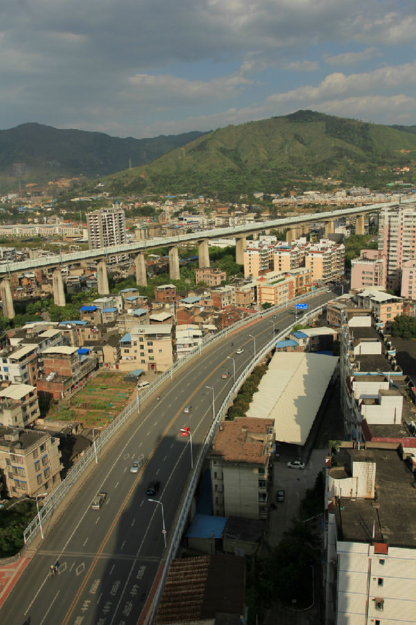 龍巖市東興高架橋位于龍巖市中心城區(qū)東北部,總投資9926萬元, 城市主干道Ⅱ級(jí),為東興路東風(fēng)橋至南環(huán)路段,該路段長(zhǎng)約740米,屬城市內(nèi)環(huán)線,車流量大,沿線與登高東路、鐵路、棋盤路及南環(huán)路相交,與鐵路平交處該路段高架橋上跨鐵路;在登高東路與東興路高架橋之間設(shè)置A、B、C、D匝道(均為單向單車道)利用4條匝道將既有登高東路與東興路相連,從而在東興路與登高路之間形成半苜蓿葉型互通式立交。高架橋全長(zhǎng)461.77米,沿線與登高東路、漳龍鐵路、棋盤路及支小路相交,本工程采用高架上跨形式,跨越相交道路與鐵路,完全解決了與鐵路平交的安全隱患。橋梁上部結(jié)構(gòu)采用(18.5+20+20)m普通鋼筋砼連續(xù)梁及25m、30m預(yù)應(yīng)力砼空心板梁,橋面連續(xù),下部采用樁接立柱接蓋梁橋墩與U型橋臺(tái),墩臺(tái)基礎(chǔ)采用鉆孔灌注樁基礎(chǔ)。