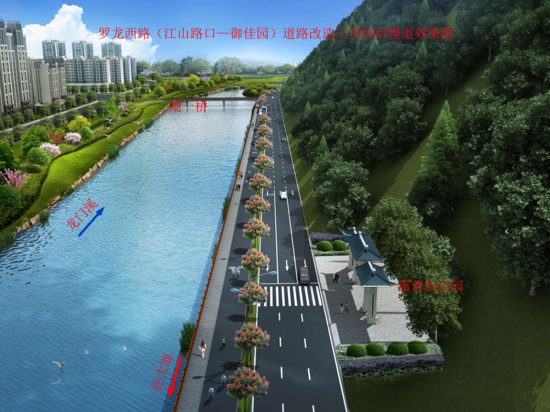 羅龍西路是連接龍巖西高速出入口與中心城市的唯一通道,其規(guī)劃改造范圍從紅竹山橋至御佳園路口,全長3855米,計劃將原道路拓寬至40米,實行雙向六車道,兩旁設2.5米非機動車道,并在湖二橋路口以東設640米入城單向三車道隧道連接至御佳園路口,原羅龍西路湖二橋至御佳園段將調整為出城單向車道。