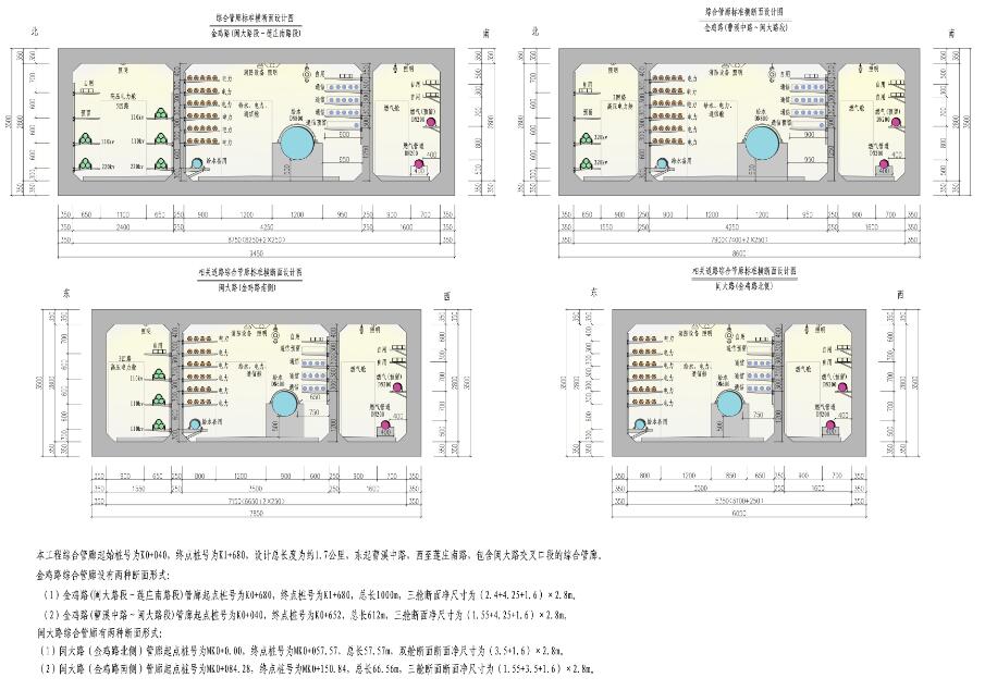 :①斷面凈尺寸為(2.4十4.25十1.6)×2.8M,艙內(nèi)管線有:給水管(管徑DN800)、通信管(16孔,含電信管、交通電纜及有線電視電纜)、電力管(30孔)、2回22KV高壓電力、3回110KV高壓電力及管廊自用電力管,并預(yù)留—定空間。②斷面凈尺寸為(1.55十4.25十1.6)×2.8M,艙內(nèi)管線有:給水管(管徑DN800)、通信管(16孔,含電信管、交通電纜及有線電視電纜)、電力管(30孔)、2回22KV高壓電力、3回110KV高壓電力及管廊自用電力管,并預(yù)留—定空間。工程總投資10500萬元。