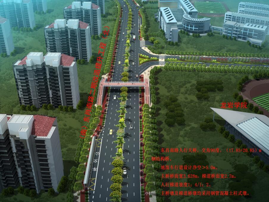 龍巖學(xué)院人行天橋位于龍巖學(xué)院大門北側(cè)約50米處,天橋采用“工”字形設(shè)計(jì),橋面長(zhǎng)40米、寬3.6米,兩側(cè)梯道坡度為1:4和1:2,跨度分別為17.85米和20.85米,寬2.7米,主橋墩及梯道橋墩均采用鋼管混凝土柱式墩,總投資約450萬元。