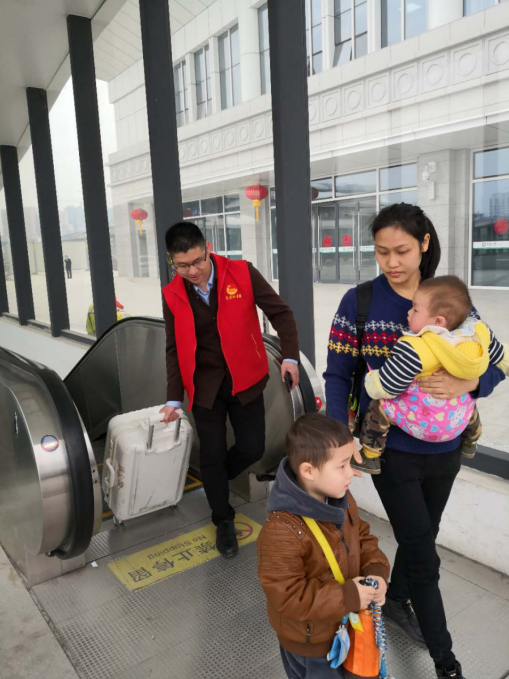 在火車站服務(wù)最需要幫助的有三種人:一種是殘疾人,一種是老年人,另外一種就是一手抱著小孩、一手提著行李的旅客因新建火車站剛剛啟用,“請問進站口在哪兒?當(dāng)一位拿著大包小包還帶著孩子的旅客問到。“在這邊,我來幫你。”志愿者一邊指著路一邊接過旅客手中的包,一路將她送至進站口。