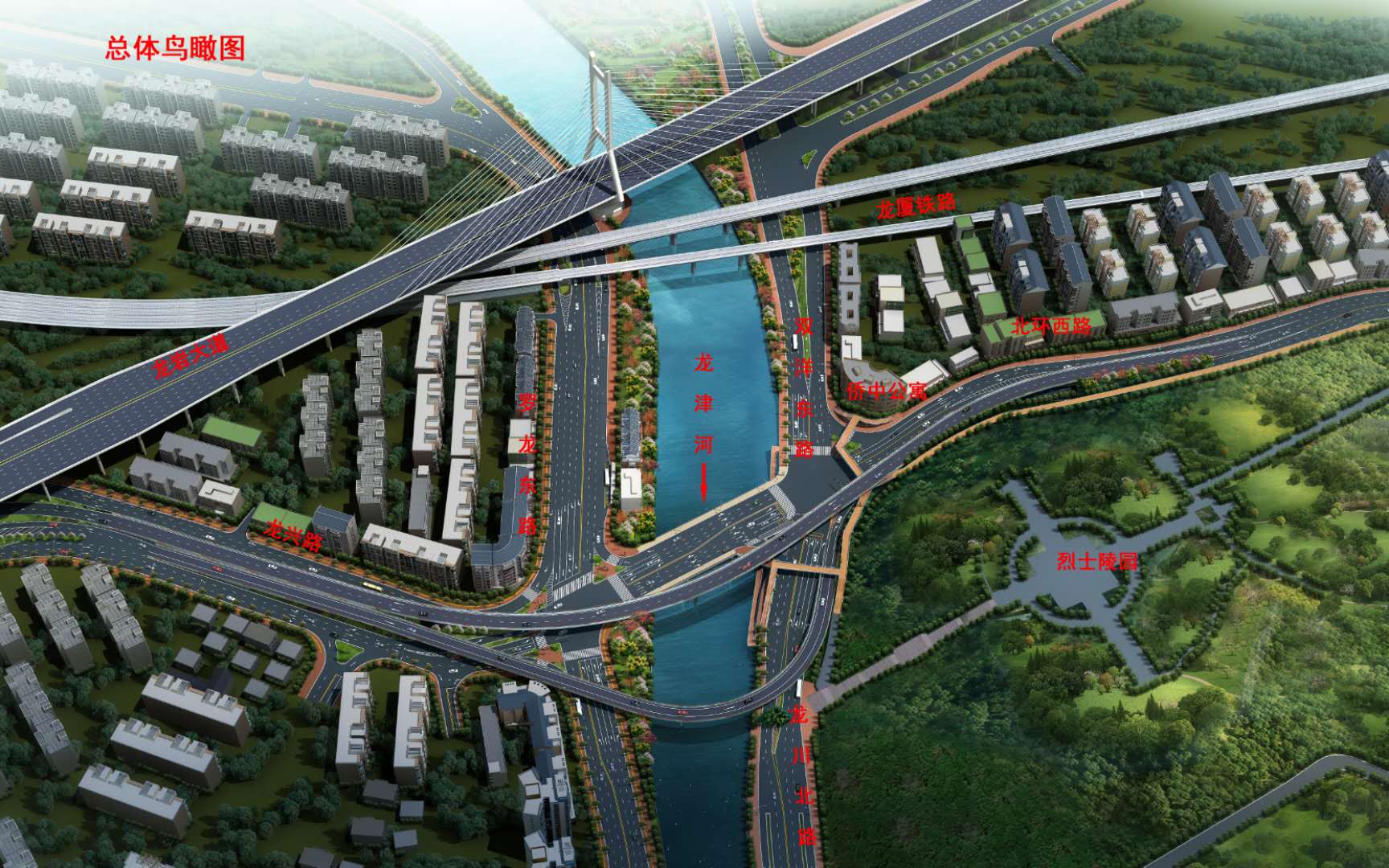 沿北環(huán)西路、龍興路設置南北分離式雙向四車道高架,南側接龍興路,北側接現狀北環(huán)西路,高架靠東側布置(緊貼烈士陵園),橋梁總長約1140米,凈寬約7.7米;在雙洋路、龍川北路、北環(huán)西路設置人行天橋,與山體步道銜接,以完善慢行系統;在烈士陵園山體下采用明挖回填方式設置框涵,長度約225米,凈寬10.75米。