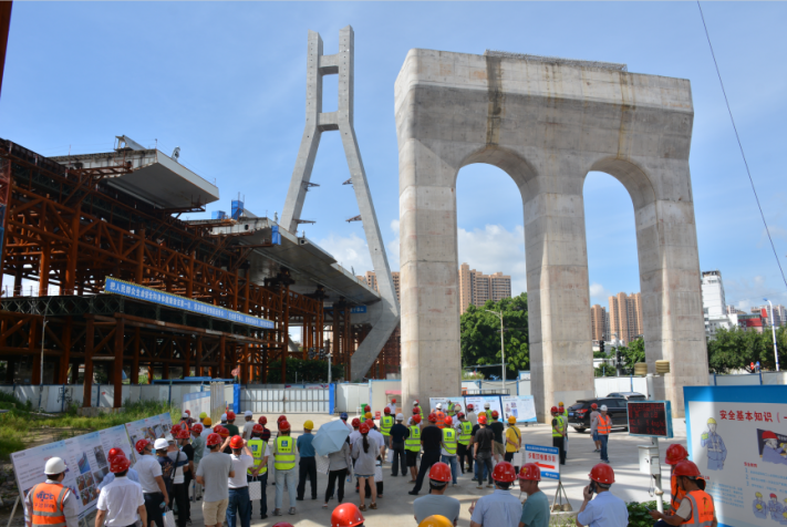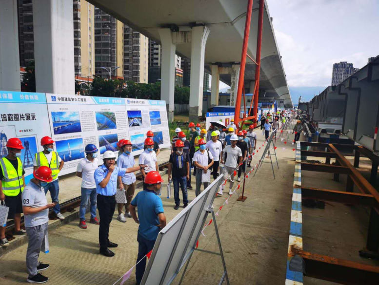 2020年6月28日,由龍巖城市發(fā)展集團有限公司主辦,龍巖市政建設(shè)集團有限公司(市城投公司)承辦,北京鐵研建設(shè)監(jiān)理有限公司、中國建筑第六工程局有限公司、中冶(上海)鋼結(jié)構(gòu)科技有限公司協(xié)辦的龍巖大道高架橋項目質(zhì)量安全標(biāo)準(zhǔn)化觀摩會在龍巖大道高架橋主橋鋼箱梁工程現(xiàn)場舉行。觀摩會分拼裝區(qū)域、提升站區(qū)域、頂推滑移區(qū)域、步履滑移區(qū)域及主橋轉(zhuǎn)體區(qū)域分別展示了龍巖大橋主橋鋼結(jié)構(gòu)拼裝、提升、弧形頂推滑移、步履滑移等新工藝及主塔“水平二次轉(zhuǎn)體”、鋼箱梁頂推、斜拉索施工技術(shù)。