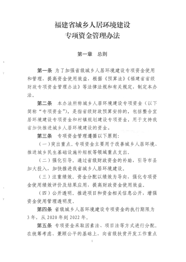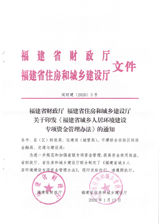 福建省財(cái)政廳福建省住房和城鄉(xiāng)建設(shè)廳關(guān)于印發(fā)《福建省城鄉(xiāng)人居環(huán)境建設(shè)專(zhuān)項(xiàng)資金管理辦法的通知》(閩財(cái)建[2020]3號(hào))